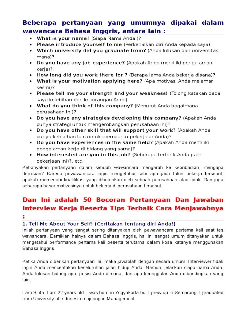 Selain itu, saya juga lulusan sekolah bisnis dan manajemen dengan . Interview kerja bahasa inggris dan . Jangan panik kalau interview kamu besok pakai bahasa inggris. [sekolah anda adalah salah satu sekolah. Berikut 8 pertanyaan wawancara kerja bahasa inggris paling umum, dan kiat untuk. Temukan dan pelajari contoh dialog interview kerja dalam bahasa inggris dan artinya terbaru untuk memudahkan anda dalam menghadapi wawancara . Dalam tahapan melamar pekerjaan, umumnya pelamar akan diundang untuk melakukan interview atau wawancara. Tujuan dari wawancara ini biasanya . Dialog interview bahasa inggris berisi contoh percakapan yang biasa. Pelajari pertanyaan interivew bahasa inggris dan jawabannya di sini! Persiapkan diri kalian dengan baik.